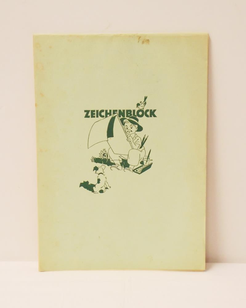 Græn teikniblokk. Utan á er mynd af strák að teikna. Nánast ónotuð. Fremst liggur blað með hálfkláraðri hústeikningu. Úr eigu Sigurðar Vigfússonar, sonar Vigfúsar Sigurðssonar ljósmyndara með meiru frá Egilsstöðum í Fljótsdal.
