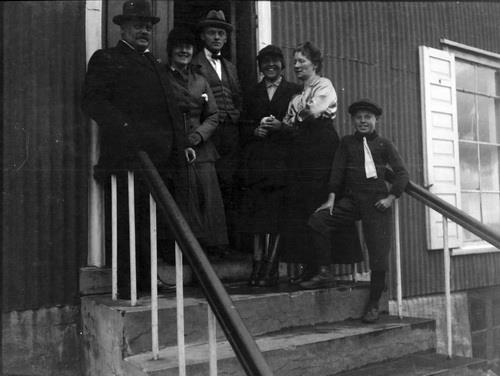 Stykkishólmur. Húsið var byggt sem íbúðarhús fyrir Sören Hjaltalín sennilega um 1880. Sören var tengdafaðir Sæmundar Halldórssonar, kaupmanns, sem verslaði í Stykkishólmi áratugum saman. Sæmundur stækkar húsið til norðurs 1896 og rak hann verslun í þeim hluta hússins og byggði pakkhúsið (sem stendur fyrir miðri myndinni) um svipað leiti. Þessi hús ganga bæði undir nöfnunum Sæmundarhús og Hjaltalínshús. Íbúðarhúsið brann 1982. 1) Sæmundur Halldórsson 2) „Gaua“ Guðrún Geirsdóttir, systir Hólmfríðar 3) væntanlega Gunnar Sæmundsson (sonur Sæmundar og Magdalenu) 4) Hólmfríður Geirsdóttir 5) Magdalena Sörensdóttir Hjaltalín Halldórsson eiginkona Sæmundar 6) væntanlega Ragnar Halldórsson yngri sonur Sæmundar og Magdalenu.