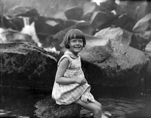 Áslaug situr á steini úti í Öxarárfossi. Í baksýn eru steinar og vatn.