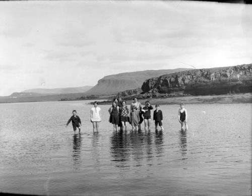 Börn og tvær konur að vaða í sjónum úti fyrir Gufunesi. Í baksýn er Úlfarsfell, lága fjallið bakvið það er væntanlega Lágafell, frekar en Mosfell.[1]Frá vinstri 1) Gunnar Zoëga 2) Helga Ída Fenger 3) Helga Zoëga 4) Hólmfríður heldur á 5) Áslaugu 6) Bryndís Zoëga 7) Dagný eða Björg Valgeirsdóttir 8) Eva Björnsson 9) Geir Agnar Zoëga 10) Garðar Emil Fenger 11) Hilmar Fenger.