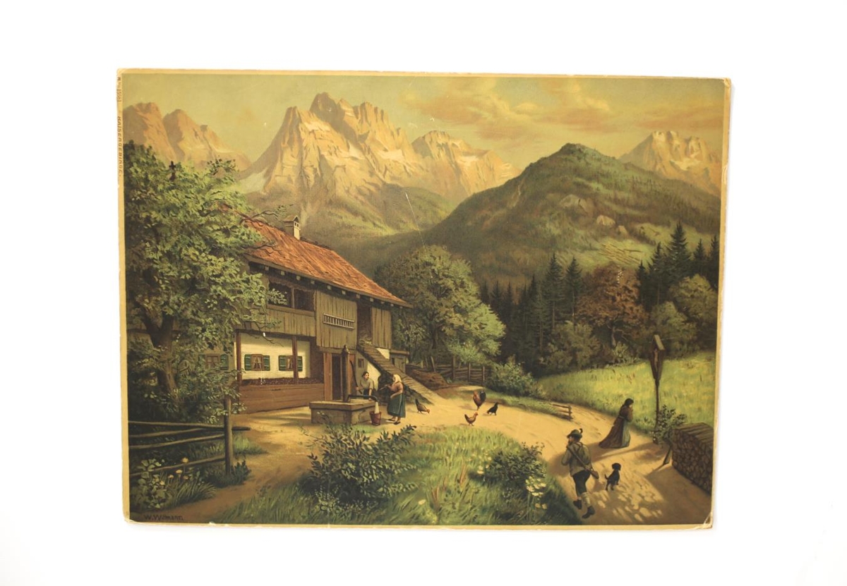 Eftirprentun af málverki eftir W. Wittmann. Alpalandslag, hús, fólk, hænsn og hundur, límt á pappa. Band límt aftan á til að hengja upp á vegg. Fjöllin heita Kaisergeisirgi. Úr eigu Sigurðar Vigfússonar, sonar Vigfúsar Sigurðssonar ljósmyndara m.m frá Egilsstöðum í Fljótsdal.