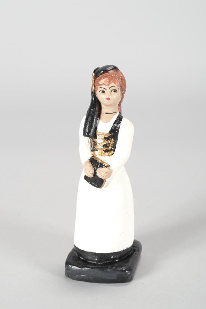 Lítil (miniature) stytta af konu í upphlut með bók í hönd