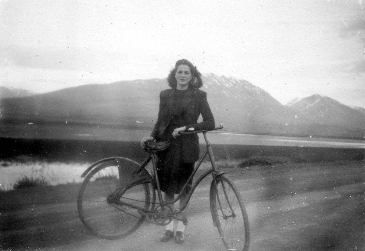 Ung kona í hjólferð við leirurnar við Akureyri. Í baksýn er Staðarbyggðarfjall.