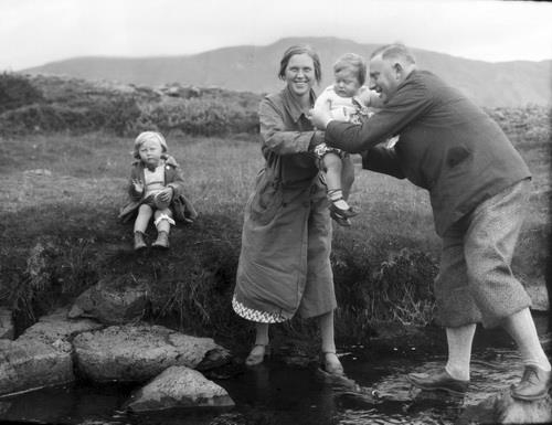 Sigrún Magnúsdóttir ferjuð yfir læk af móður sinni Guðrúnu Geirsdóttur og föður sínum Magnúsi Jochumsyni. Helga Magnúsdóttir situr á bakkanum.