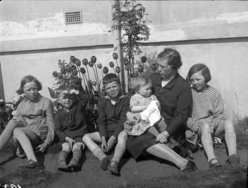 Fyrir utan Túngötu 20. 1) Bryndís 2) Gunnar 3) Geir Agnar 4) Hólmfríður heldur á 5) Áslaugu 6) Helga. Bak við þau er húsveggurinn að Túngötu 20 og upp við hann eru túlípanar og lítil reynitré. Með myndinni stendur „Börnin 1927".
