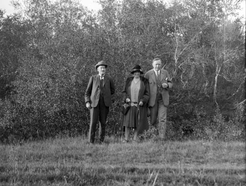1) væntanlega Guðmundur Hannesson prófessor 2) Hólmfríður 3) Geir Zoëga. Þau standa þrjú í röð fyrir framan mikið trjákjarr. Merkt Ferðalög 1929.