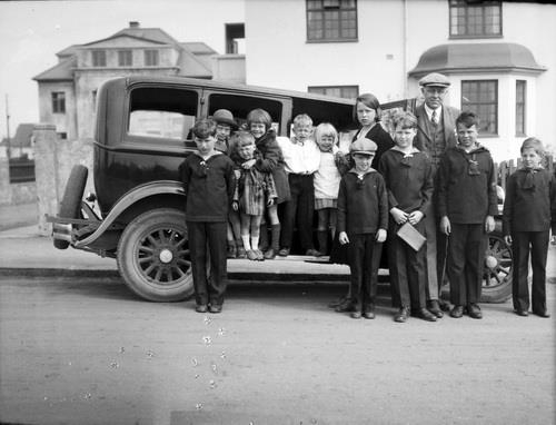 GZ og ellefu börn standa fyrir framan bifreið sem stendur fyrir framan húsið að Túngötu 20. Fimm barnanna standa upp á hliðinni á bílnum. Þau eru frá vinstri: 1) 2) 3) Áslaug 4) 5) Ingileif. Þeir sem standa á götunni frá vinstri eru: 1) 2) 3) Bryndís 4) Hilmar Fenger 5) Geir Zoëga 6) Geir Agnar. Merkt Börnin og fleira 1932.