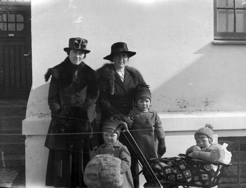 Ebba Richardsson, Hólmfríður, tvíburarnir Helga (með feldinn um hendurnar) og Bryndís (stendur hærra) og Geir Agnar í kerrunni. Hann er með hvítan púða við bakið og heklað teppi ofan á sér. Systurnar eru í eins kápum og með eins húfur. Konurnar eru báðar í kápum, með hatta og feldi um herðar. Standa undir vegg við Túngötu 20. Lengst til vinstri á myndinni sést útidyrahurðinni á Túngötu 20.
