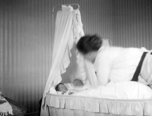 Tvíburarnir Helga og Bryndís nýfæddar árið 1917. Liggja saman í vöggu. Kona beygir sig yfir þær, væntanlega Hólmfríður móðir þeirra. Myndin er hreyfð.