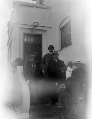 Fólk á tröppunum fyrir utan Túngötu 20. Fremst á myndinni, neðst, eru tvíburasysturnar Bryndís og Helga. Frá hægri í miðröð: 1) væntanlega Kristjana Jóna Geirsdóttir 2) John Fenger 3) Geir Agnar sem 4) Hólmfríður Geirsdóttir heldur á. Efst eru frá vinstri Geir rektor og Geir Zoëga. Myndin er skemmd.