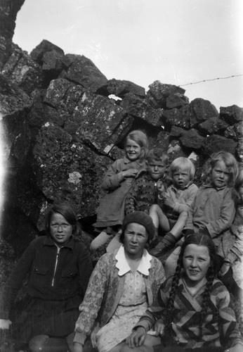 Efri röð frá vinstri: 1) Dagný Valgeirsdóttir 2) Hallvarður Valgeirsson 3) Ingileif Zoëga 4) Björg Valgeirsdóttir, sést aðeins glitta í annað barn við hliðina á henni. Neðri röð frá vinstri: 1) Bryndís 2) Helga Ída Fenger 3) Helga. Bakvið þau er grjótveggur og gaddavír efst.