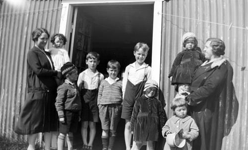 1) væntanlega Kristjana Jóna Geirsdóttir, systir Hólmfríðar 2) Ebba Fenger 3) Glahn 4) Garðar Emil Fenger 5) Geir Ulrik Fenger 6) Hilmar Fenger 7) Áslaug 8) Helga Magnúsdóttir 9) Ingileif 10) Hólmfríður. Standa fyrir framan bárujárnsklætt hús.