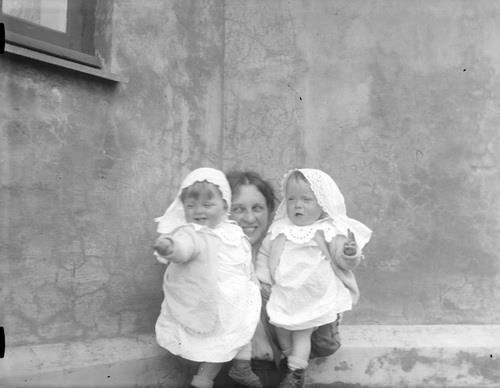 Hólmfríður heldur á dætrum sínum, tvíburunum Helgu (vinstra megin) og Bryndísi (hægra megin) undir húsvegg á Túngötu 20. GLERPLATA.