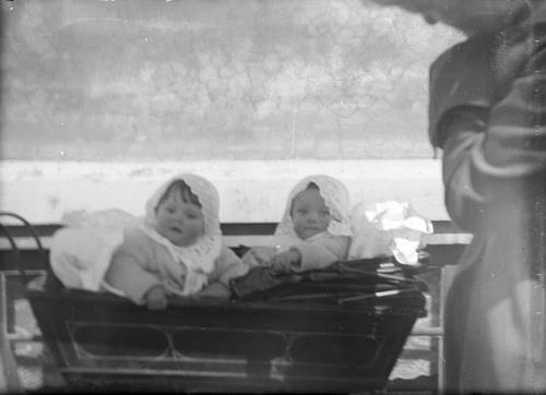 Tvíburarnir Helga (vinstra megin) og Bryndís (hægra megin) saman í vagni undir húsvegg á Túngötu 20. GLERPLATA.