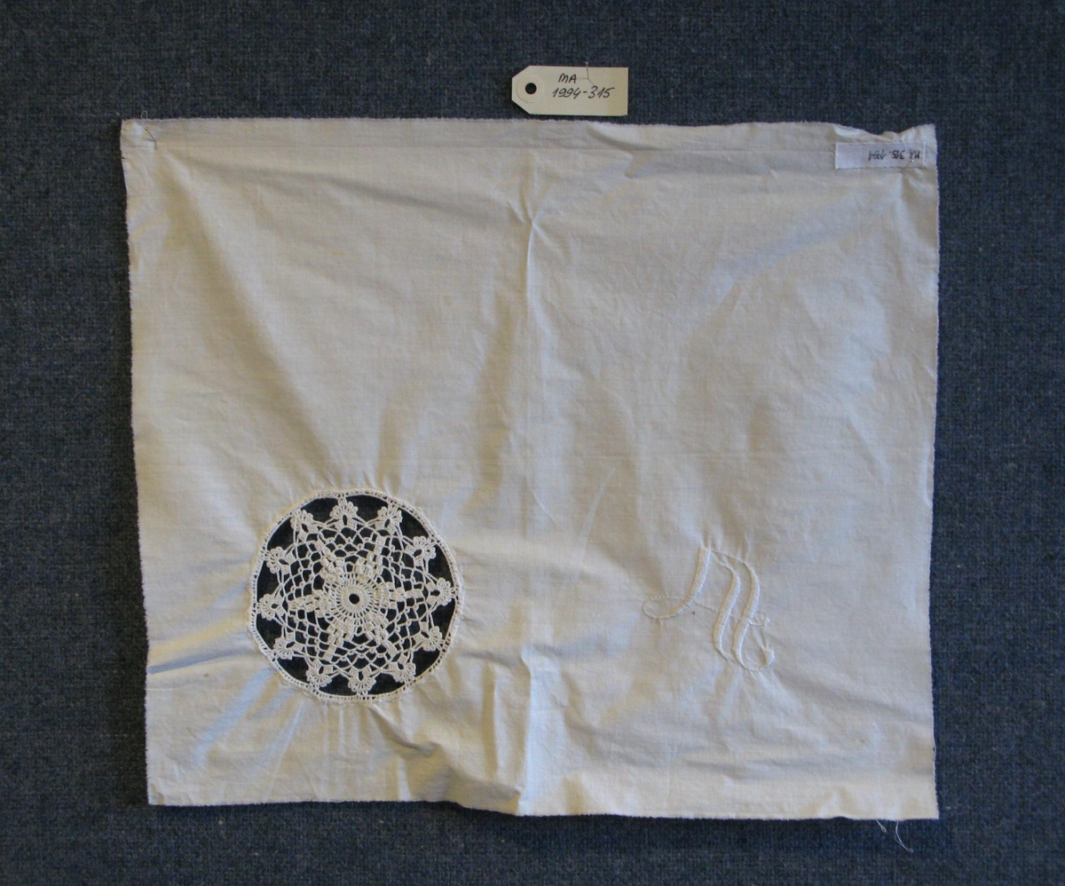 Hvítt efra borð úr koddaveri með heklaðri kringlu og ísaumuðum upphafsstaf, líklega "V". Gulnað. Úr eigu Vigfúsar Sigurðssonar (f.3.08.1880 d.13.09.1943) frá Egilsstöðum í Fljótsdal. Hlutinn gerði Soffía Elíasdóttir, kona Vigfúsar.