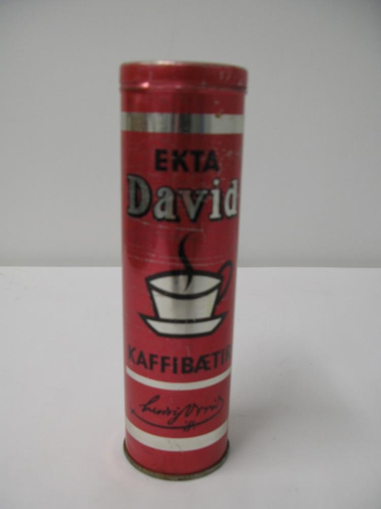 Rauður og silfraður staukur undan kaffibæti, tómur. Framan á honum stendur "Ekta David Kaffibætir". Aftan á stauknum er mynd af kaffibolla og undir honum: "!/5 kg. Ludvig David er framúrskarandi bragðgóður og ilmsterkur kaffibætir framleiddur úr bestu hráefnum. Ludvig David geymist bezt á svölum og ekki of þurrum stað. Kaffibætisverksmiðja O. Johnson & Kaaber hf. Reykjavík."