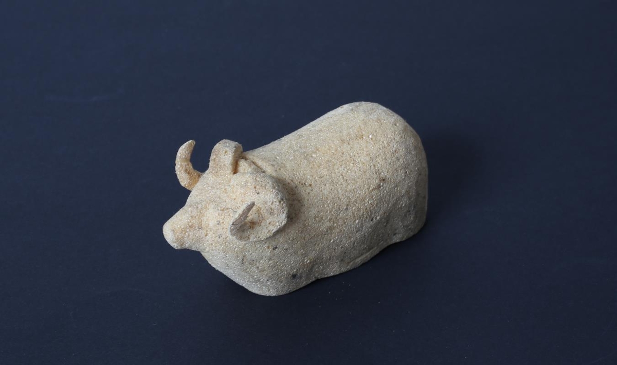 Liggjandi hrútur tálgaður úr drapplituðu frauðplasti. Guðmundur Þorsteinsson frá Lundi skar út talsvert af dýrum í plast og við. Þessi voru á vinnustofu hans þar sem hann gerði við gamla hluti.
