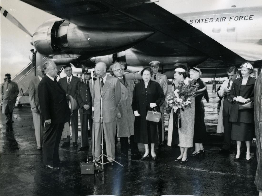 Dwight D. Eisenhower forseti Bandaríkjanna flytur ávarp á Keflavíkurflugvelli.