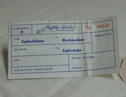 Flugmiði frá Flugfélagi Íslands h/f, Iclandair no. 36549, frá Egilsstöðum til Reykjavíkur. Fargjald kr. 341.-. Farseðill 2. Aftan á er lesning um slysatryggingar. Var í peningaveski ásamt nafnskírteini Þorbjörns Arnoddsonar. Nafnskírteinið var afhent til varðveislu á Héraðsskjalasafninu. Úr dánarbúi Pálínu Waage kaupkonu á Seyðisfirði.