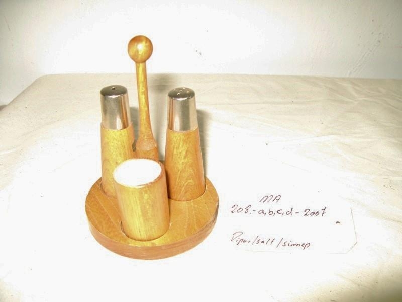 Kringlóttur tréstandur með stétt sem eru sæti fyrir piparstauk - salt - sinnep. Tréstautur gengur upp úr miðjum hringnum með hnúð á endanum. Úr dánarbúi Pálínu Waage kaupkonu á Seyðisfirði.
