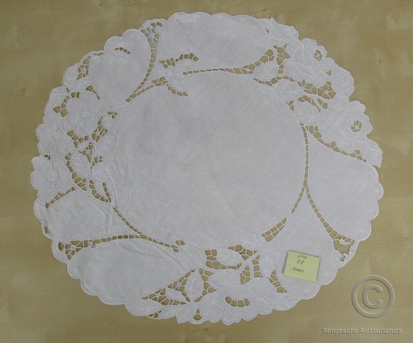 Dúkur úr hör, sporöskjulagaður saumaður með harðangurssaumi og hvítsaumi. Hör og útsaumsgarn er hvítt að lit. Dúkurinn er kominn úr dánarbúi Jóhanns Klausen, Hólsvegi 11, Eskifirði. Gefandi er eftirlifandi seinni eiginkona hans, Sigurbjörg Sigbjörnsdóttir. Fyrri kona hans var Auðbjörg Jakobsdóttir.