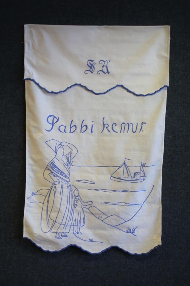 Puntuhandklæði í eldhús. Hvítt léreft. Útsaumur: "Pabbi kemur, SÁ" og mynd af konu og barni horfandi út fjörðinn á bát sem nálgast. Útsaumuð með bláu garni. SÁ stendur fyrir Sólveigu Ásmundsdóttur, tengdamóður Jóhanns frá fyrra hjónabandi. Hún var gift Jakobi Jakobssyni og bjuggu þau á Strönd, Neskaupsstað. Handklæðið er komið úr dánarbúi Jóhanns Clausen, Hólsvegi 11, Eskifirði. Gefandi er seinni eiginkona hans, Sigurbjörg Sigurbjörnsdóttir, Fyrri kona hans var Auðbjörg Jakobsdóttir.