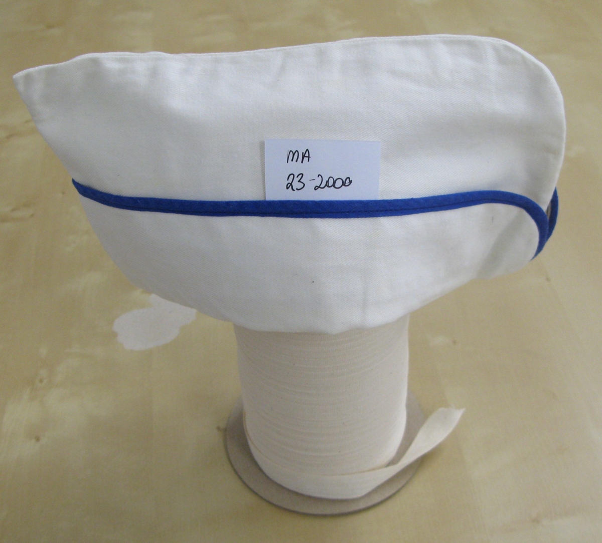 Einkennishúfa, húfa notuð í matvælaiðnaði. Hvítt léreft með bláum kanti á uppábroti. Húfan er komin úr dánarbúi Jóhanns Klausen, Hólsvegi 11, Eskifirði. Gefandi er eftirlifandi seinni eiginkona hans, Sigurbjörg Sigurbjörnsdóttir. Fyrri kona hans var Auðbjörg Jakobsdóttir.