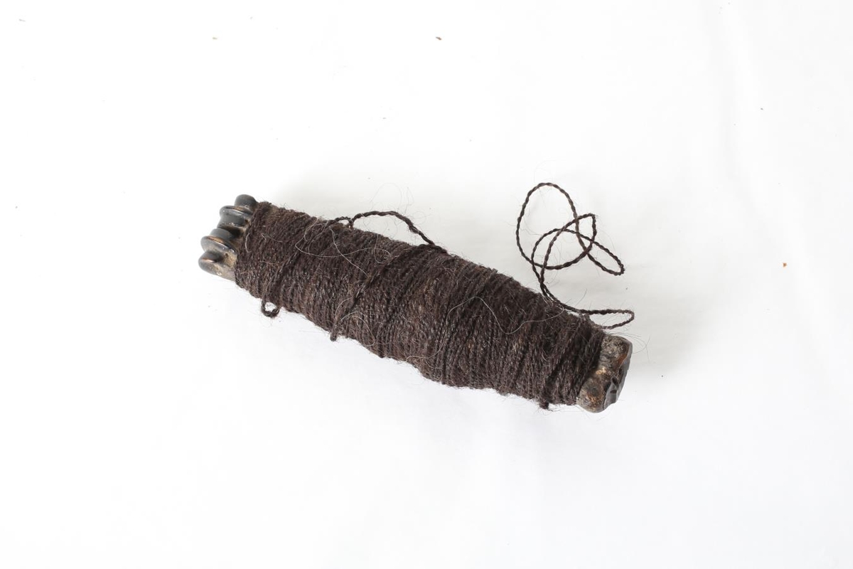 Svartlitaður sauðaleggur með svörtu togbandi. Bandið er unnið og spunnið af móður gefanda. Tvær nálar fylgja með leggnum; Önnur er 4,5 cm. og mjög ryðguð en hin er með þræði í gegnum augað og er 5,5 cm á lengd. Oddurinn hefur verið beygður.