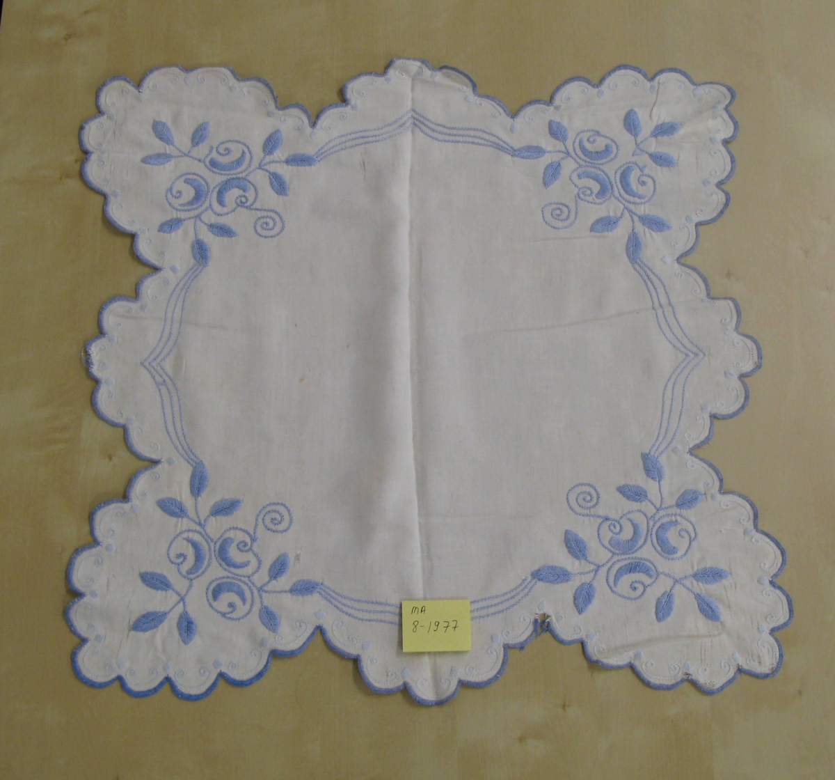 Hvítur, kantar og horn saumuð með ljósbláu. Blómamynstur. Samstæður no. 9. Frá Hallfreðarstöðum.