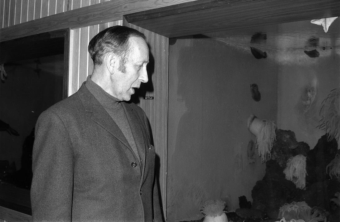 Vestmannaeyjar 1969. Karlmaður stendur við fiskabúr.