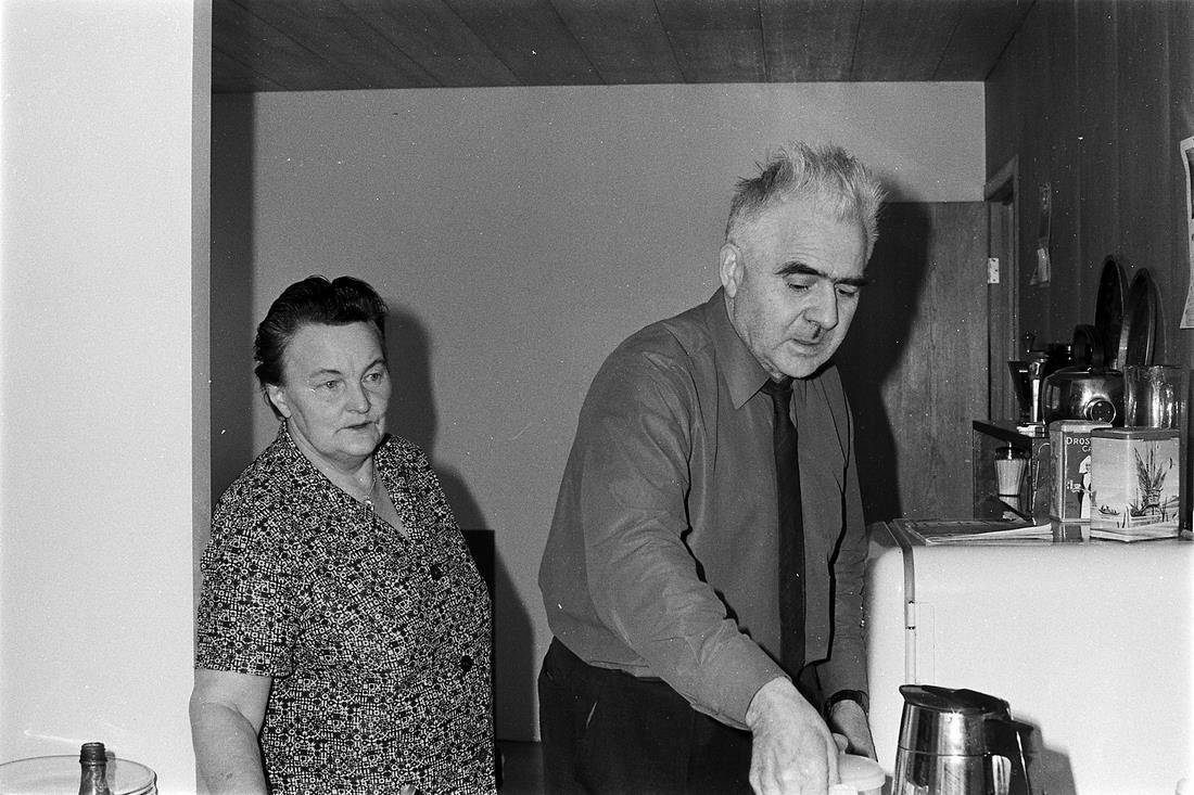 Vesturlandsferð, apríl 1969. Karlmaður og kona inni í eldhúsi.