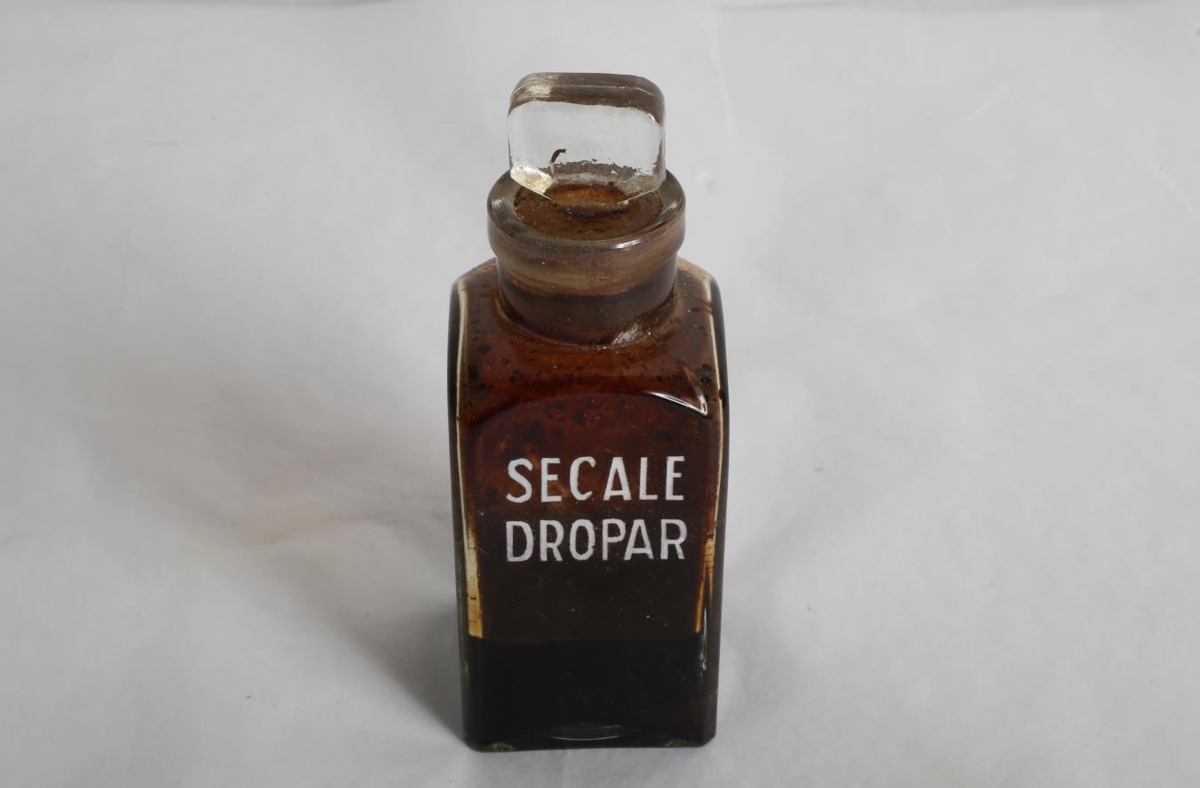 Ferköntuð glerflaska með glertappa, merkt "Secle-dropar". Ljósmæðraáhöld Jónínu Gunnarsdóttur (f.02.09.1899), ljósmóður í Hlíðarhreppi frá 1922-1964 og Tunguhreppi 1926-1927. Bjó lengst af á Fossvöllum. Var kunningjakona og sveitungi gefanda.