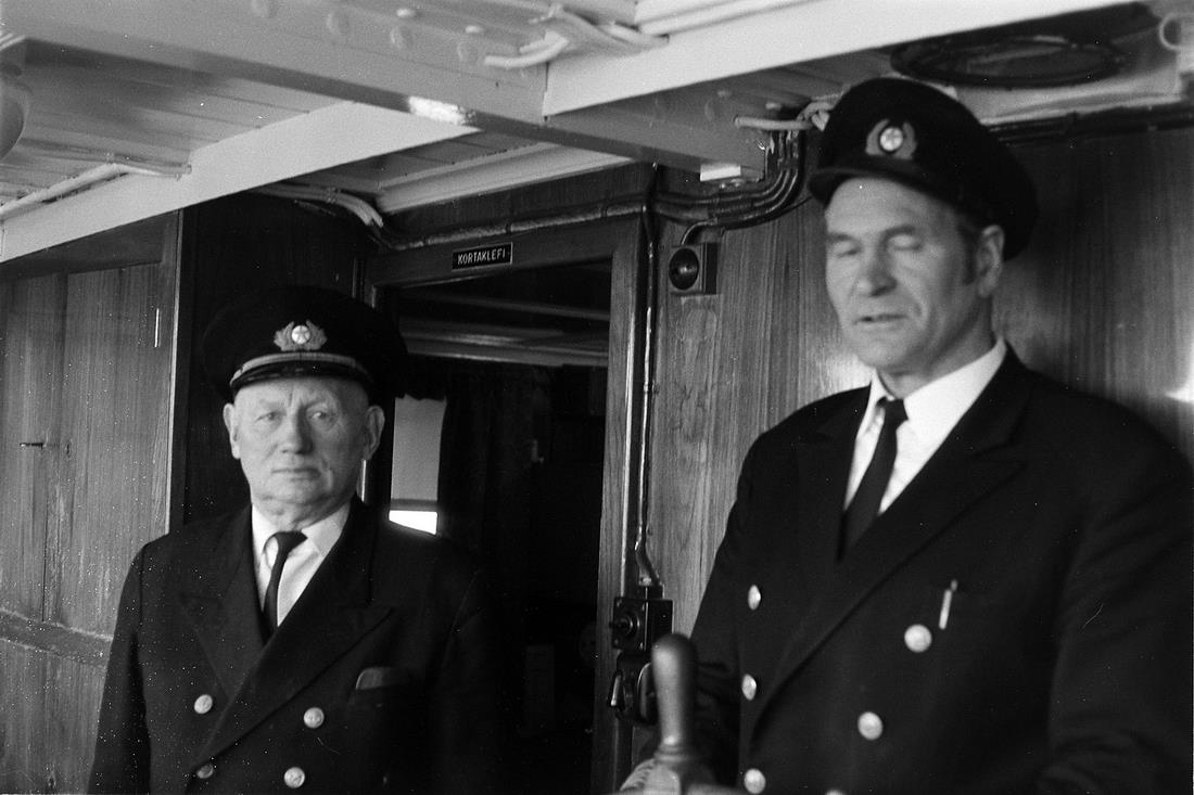 Vesturlandsferð, apríl 1969. Skipstjóri og stýrimaður í brúnni.