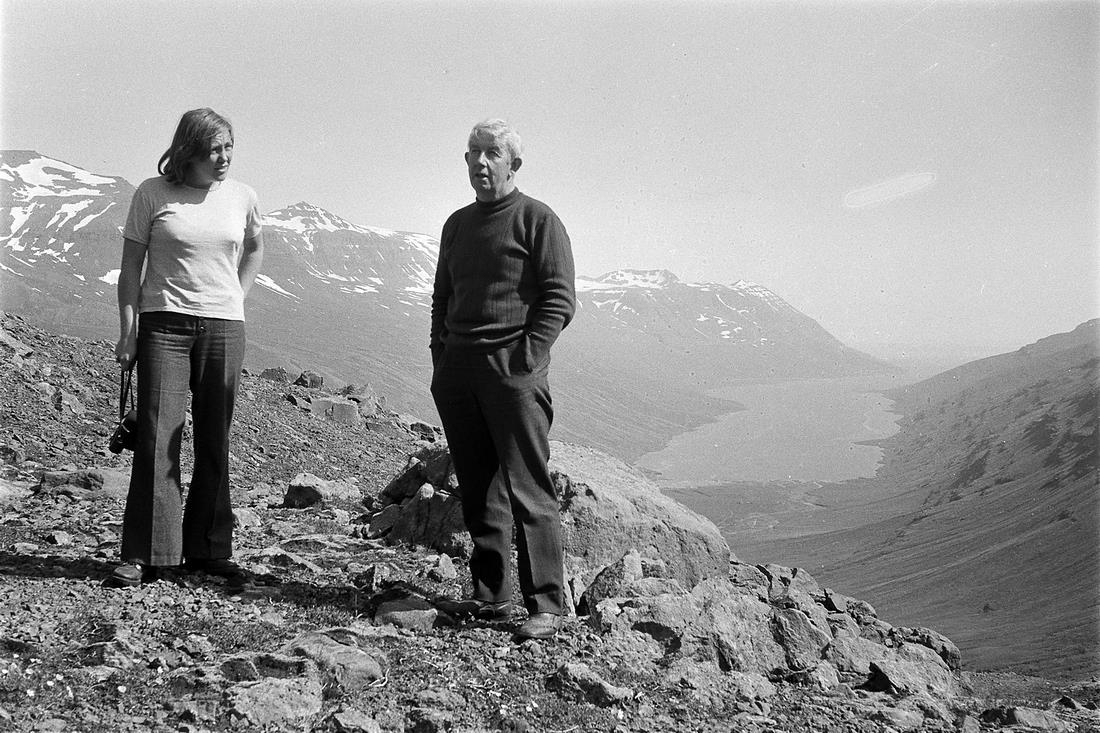 Mjóifjörður. Brekka, Dalatangi, júní 1970. Kona og Vilhjálmur Hjálmarsson, Mjóifjörður í baksýn.