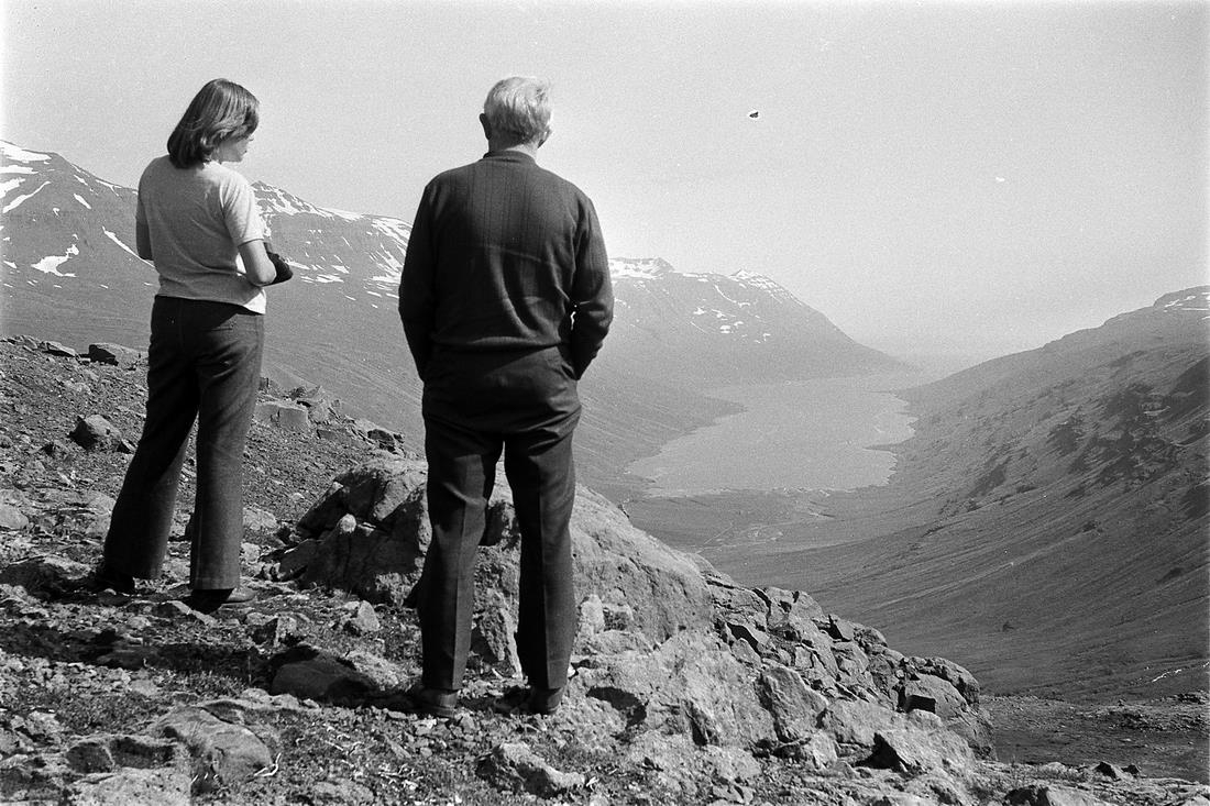 Mjóifjörður. Brekka, Dalatangi, júní 1970. Kona og Vilhjálmur Hjálmarsson, horfa niður í Mjóafjörður.