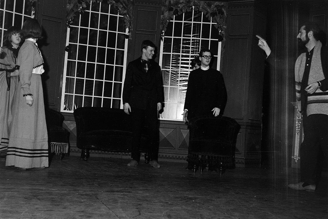 Þjóðleikhúsið. Herranótt, febr. 1966. Krakkar í grímubúningum. Leikarar á sviði.