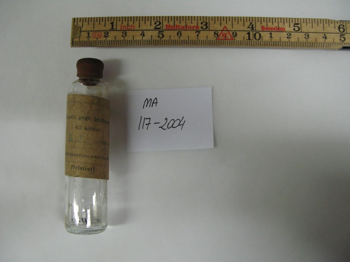 Glært glas með gúmmíhettu. Áletrun: "Bóluefni gegn bráðapest í 40 kindur. Nr. ... Rannsóknarstofa háskólans: Hristist." Úr eigu Eiríks Sigfússonar frá Giljum.