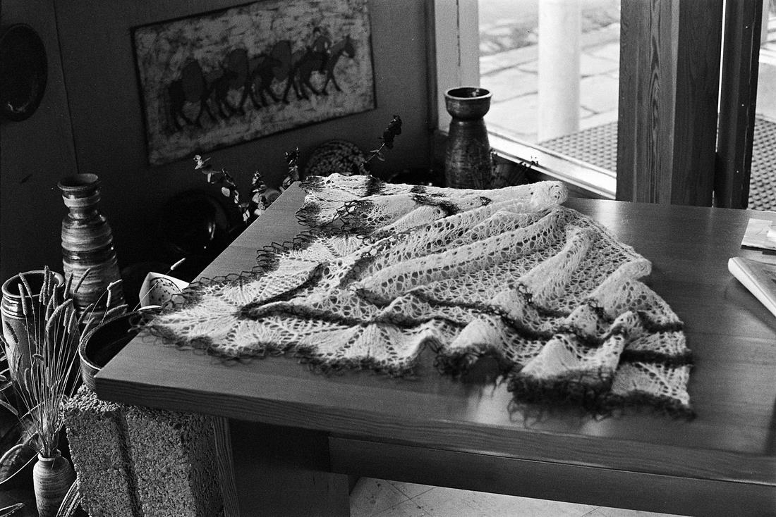Laufásvegur. Hyrnur úr íslenskri ull. Heimilisiðnaðarfélag Íslands, okt. 1967. Falleg hyrna.