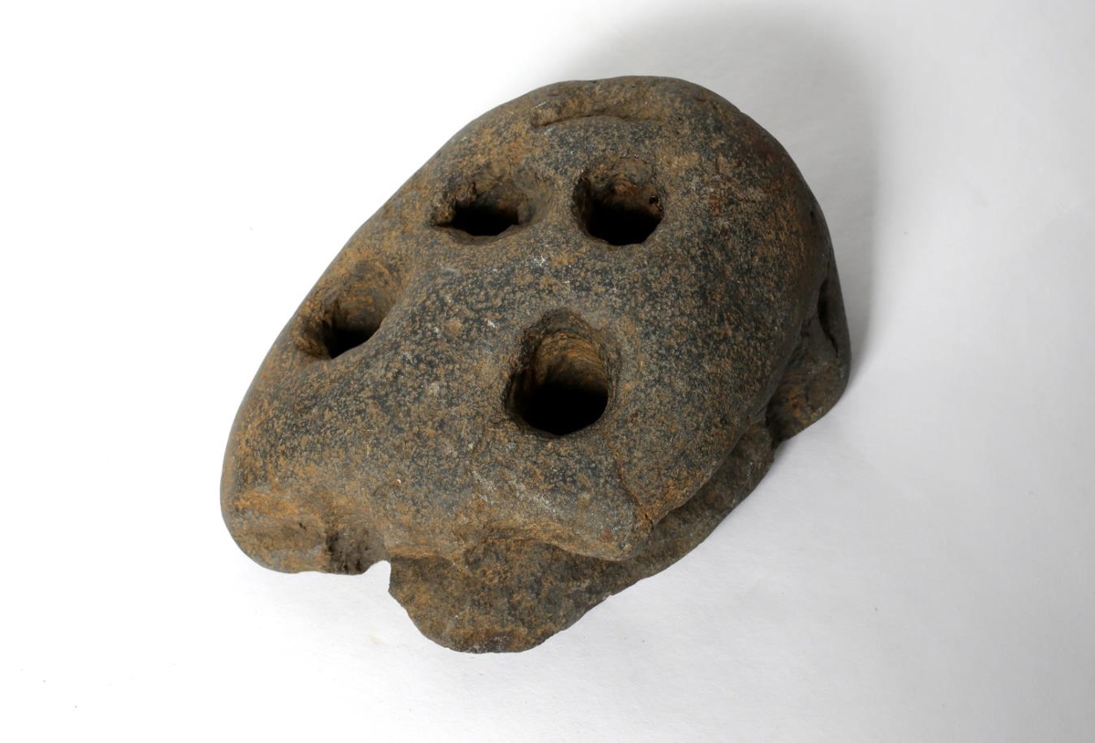 Úr dökku bergi, svolítið grófu. Tvö göt í gegn og tvær djúpar holur sem hugsanlega hafa átt að ná í gegn líka. Í aðfangabók er talað um sex steina, þrjá af skellihurðum og þrjá líklega kljásteina. Fundust í rústunum á Giljum. Nú eru aðeins tveir sjáanlegir.