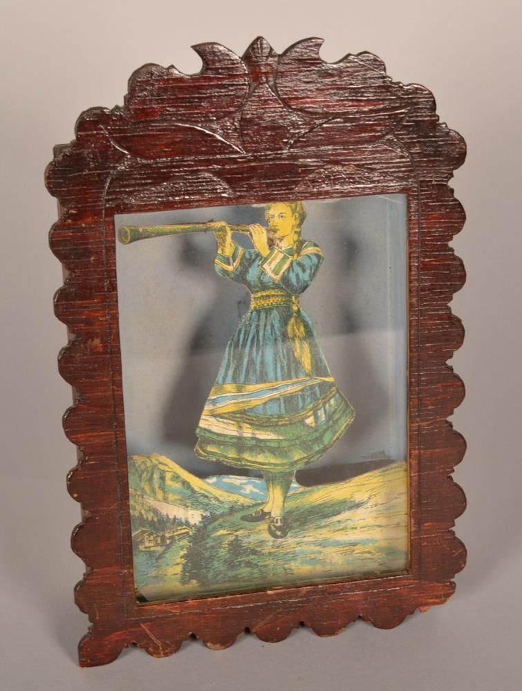 Stúlkumynd í djúpum viðarramma. Ramminn eða kassinn er úr 3 mm krossvið og 6 mm borðvið, dökkbæsað og lakkað og með glerloki. Í miðjum kassa stendur sjálfstæð teiknuð litmynd límd á karton. Myndin er af stúlku úr Ölpunum sem er að leika á lúður