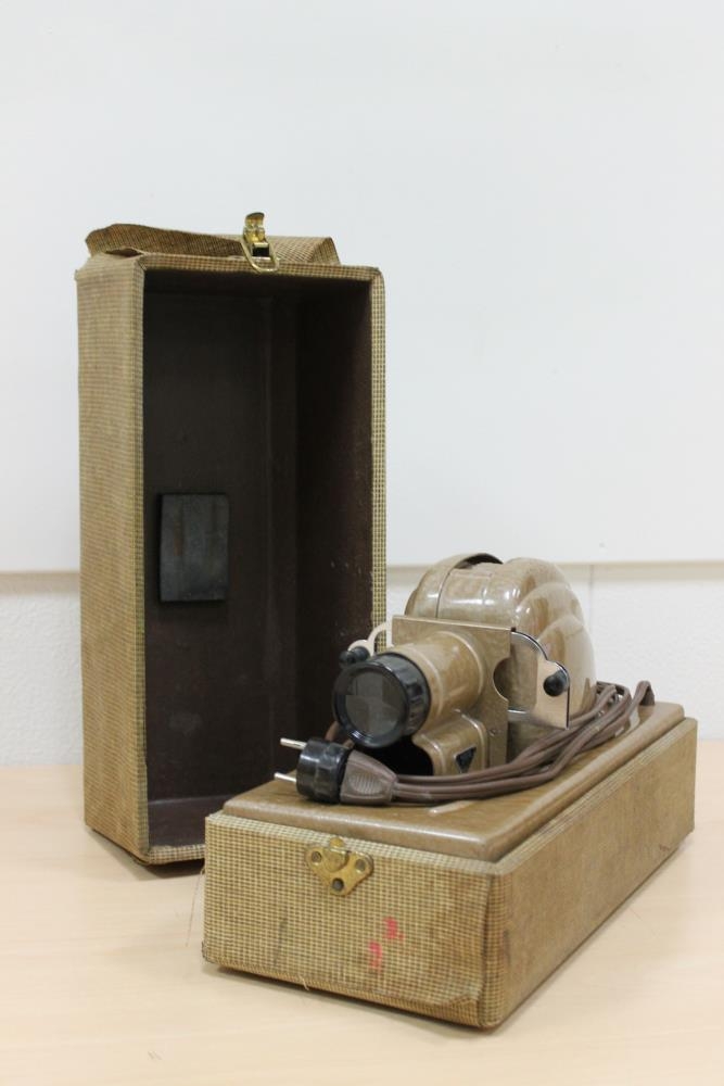 Slides sýningarvél: Vuaid projector, gömul litskyggnusýningarvél í kassa. Áklæði kassans byrjað að rifna.