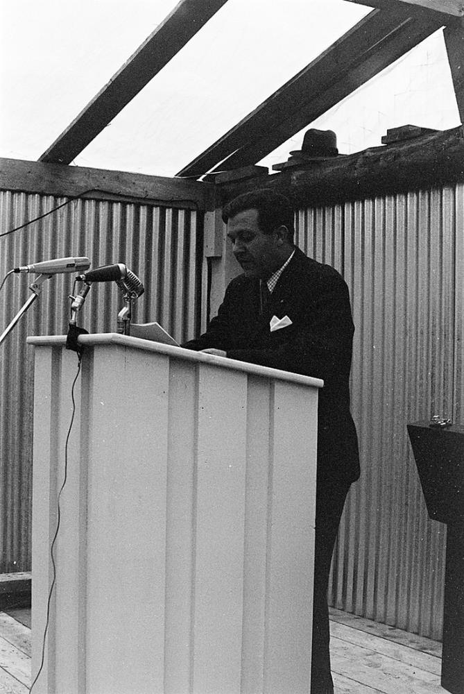 A-Skaft. Vígsla Jökulsárbrúar 2. sept. 1967. Karlmaður flytur ræðu.