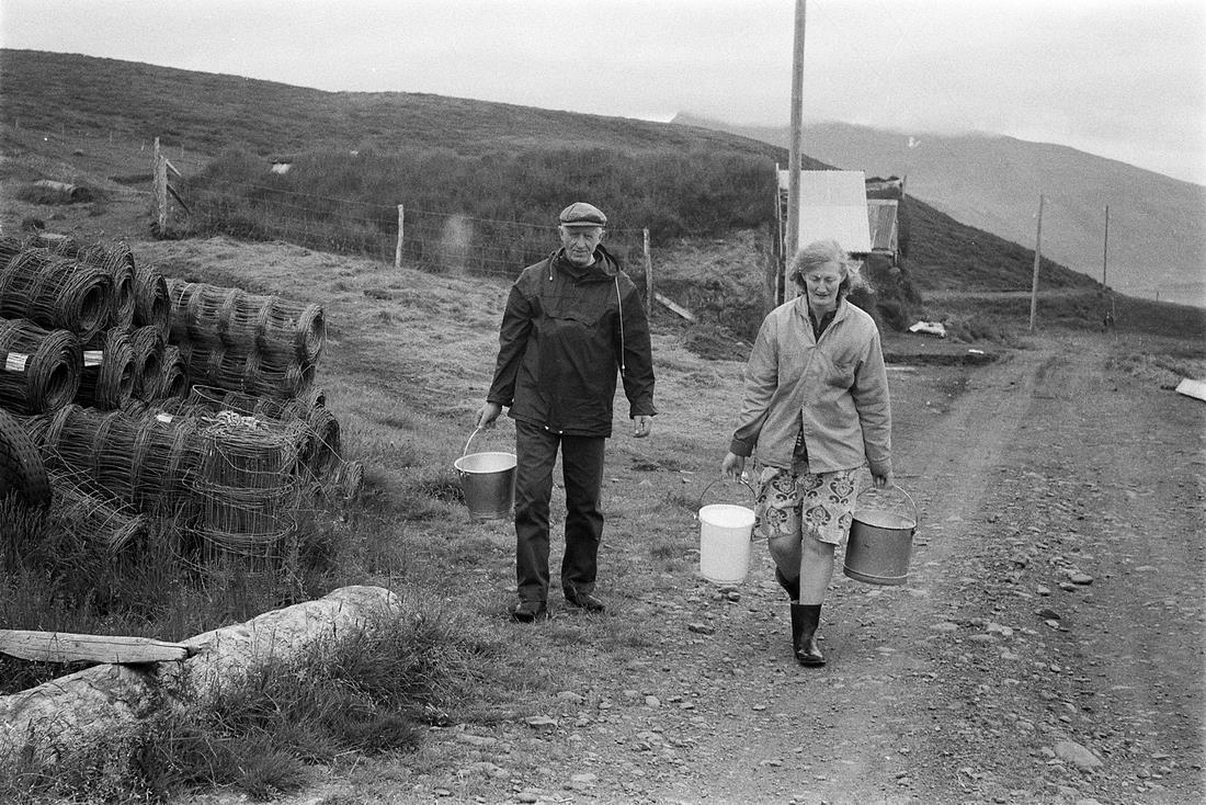 Skaftafell, júlí 1973. Karlmaður og kona með mjólkurfötur.