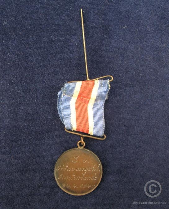 Verðlaunapeningur úr bronsi, með borða og prjóni. Áletrun: 3v. víðavangshlaup Austurlands 24.04.1947. Verðlaunagripur. Úr eigu Eiríks Sigfússonar frá Giljum.