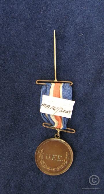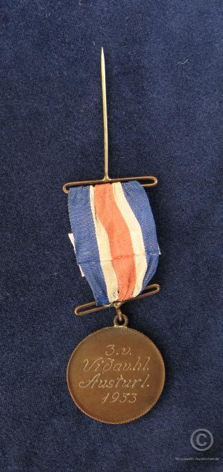Verðlaunapeningur úr bronsi, með borða og prjóni. Áletrun: 3.v. víðavangshl. Austurl. 1953. Bakhlið: U.F.E. Verðlaunagripur. Úr eigu Eiríks Sigfússonar frá Giljum.