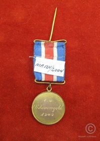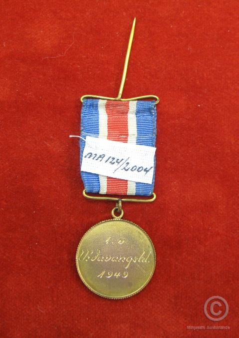 Verðlaunapeningur úr gulli, með borða og prjóni. Áletrun: 1.v. víðavangshlaup 1949. Bakhlið: U.M.F.E. Verðlaunagripur. Úr eigu Eiríks Sigfússonar frá Giljum.