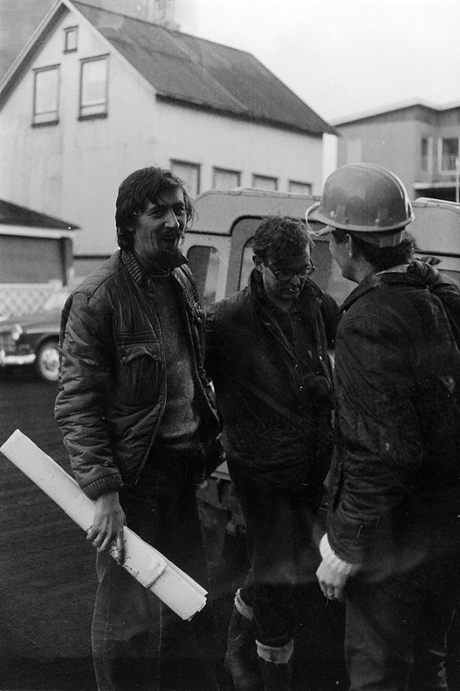 Vestmannaeyjagosið 1973, fyrsta nóttin. Þrír karlmenn standa úti á götu, einn með hjálm.