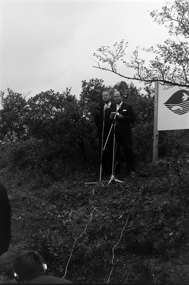 Austur-Skaftafellssýsla. Skaftafell afhent sem þjóðgarður, okt. 1967. Þjóðgarður. Trjágróður. Skilti. Tveir menn standa við hljóðnema.