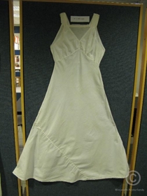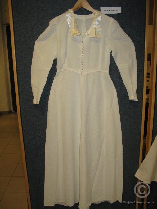 Fermingarkjóll úr kremhvítu krepi og undirkjóll úr lérefti (MA-1989-75 b). Kragi úr hvítu atlassilki. Alveg gólfsíður. Saumaður á gefanda sem fermingarkjóll. Móðir gefanda Kristjana Guðmundsdóttir saumaði.