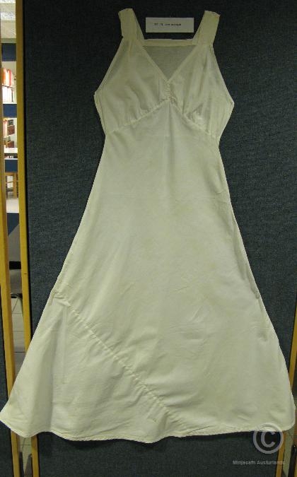 Hvítur undirkjóll til að nota undir fermingarkjól Gunnþórunnar Hvannar, MA-1989-75. Síður með hlýrum, breiðum yfir axlir og blúndu í hálsmáli. Saumaður á gefanda af móður hennar.